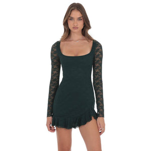 Lace Ruffle Long Sleeve Dress in Green
