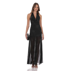 Rhinestone Plunge Cowl Neck Maxi Dress in Black