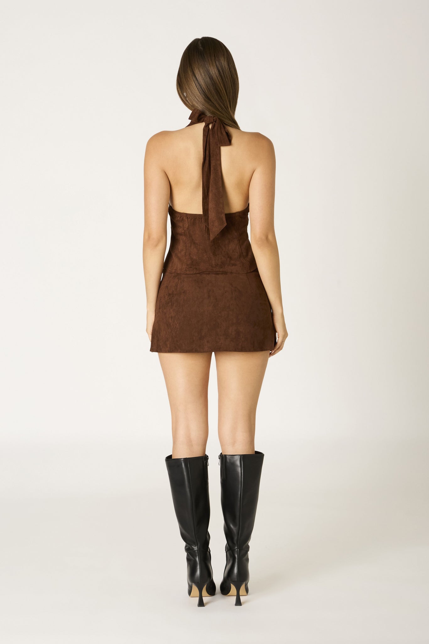 This faux suede halter top features a deep plunging neckline with grommet details, a front buckle closure, and an open tie-back design.