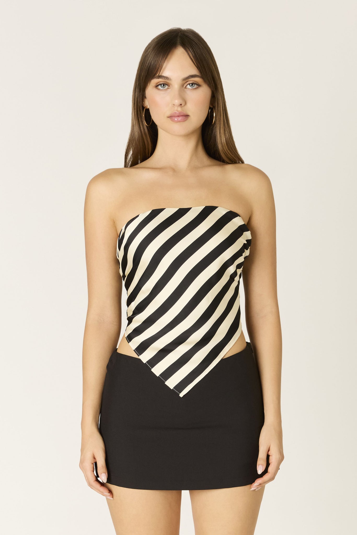 This strapless bandana top features a diagonally draped bodice with soft ruching through the sides, a pointed hem, and an adjustable tie-back closure.