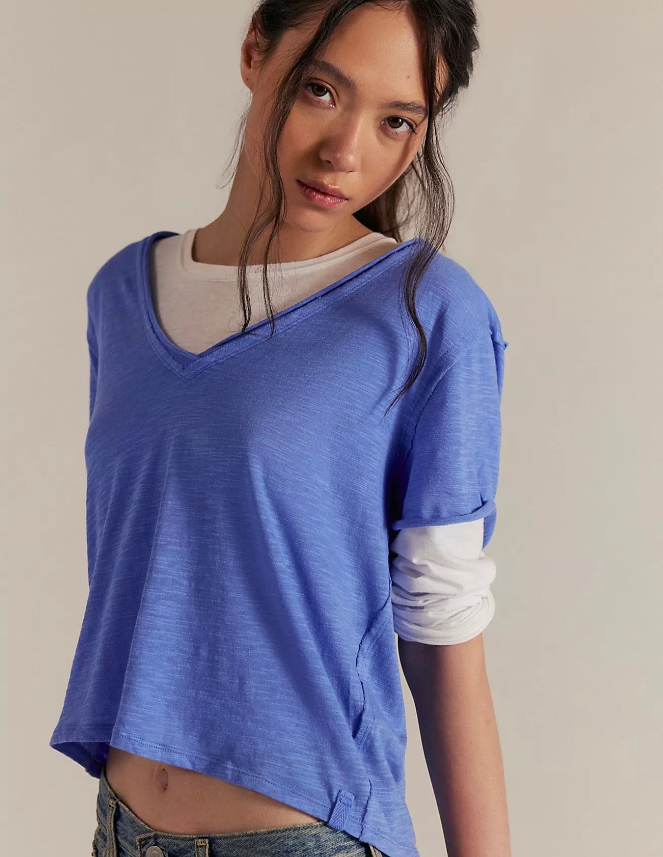 Perfect for layering, this short-sleeved tee is featured in a boxy cut and a V-neckline for endless outfitting potential.