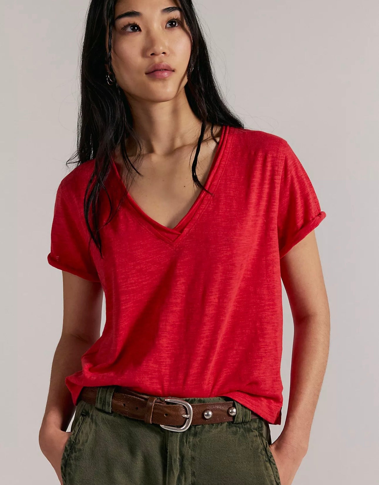 Perfect for layering, this short-sleeved tee is featured in a boxy cut and a V-neckline for endless outfitting potential.